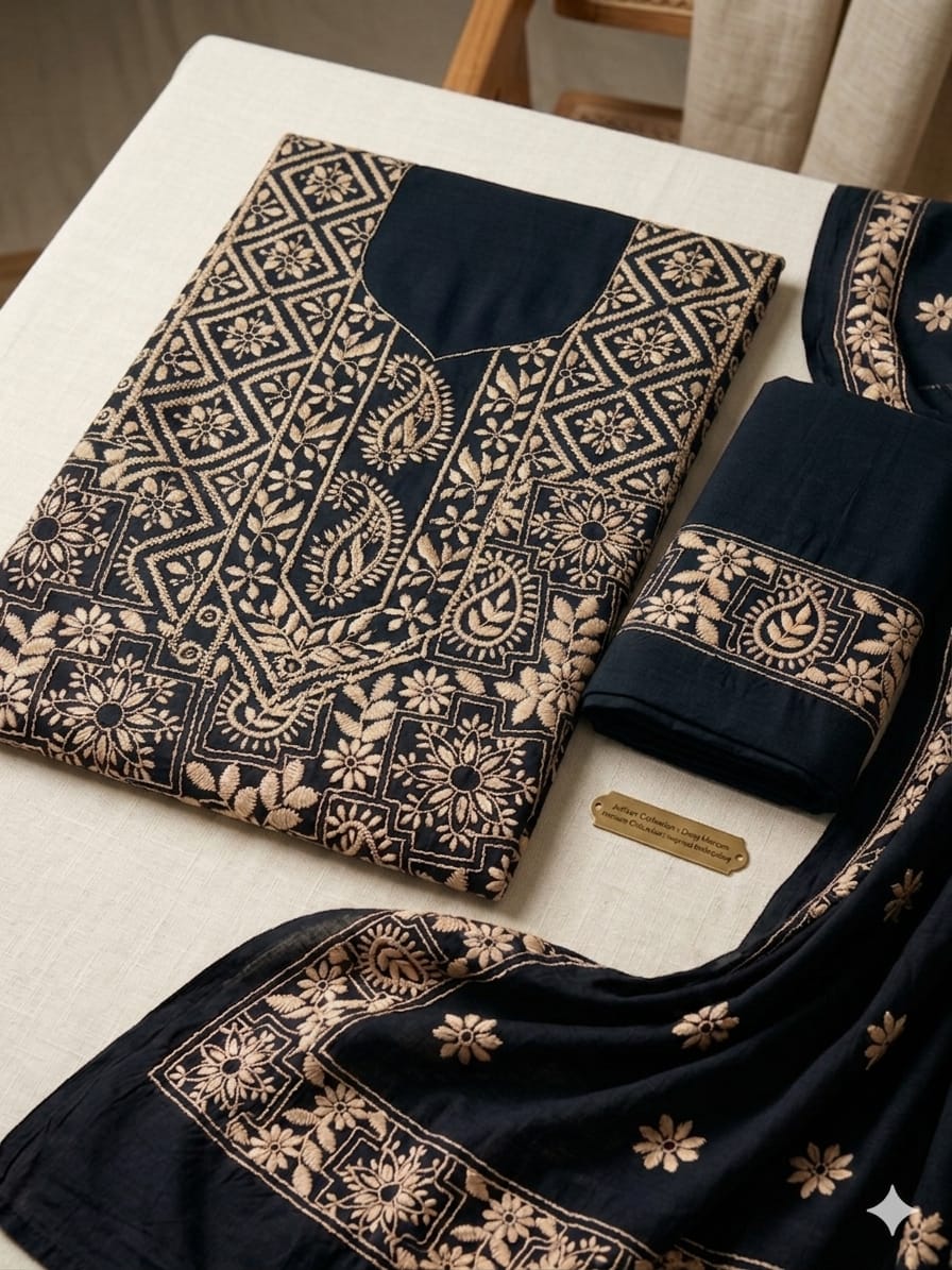 আকর্ষণীয় ডিজাইনের এই হাতের কাজের থ্রি-পিসটি স্টাইল ও আরামের একটি চমৎকার সমন্বয়। কালো রঙের কাপড়ের উপর সূক্ষ্ম সুতার নিখুঁত হ্যান্ড এমব্রয়ডারিতে ফুটে উঠেছে জ্যামিতিক ও ফুলেল ট্র্যাডিশনাল নকশা, যা ড্রেসটিকে করে তুলেছে এলিগেন্ট ও ইউনিক। জামার গলা ও সামনের অংশ জুড়ে সুন্দরভাবে করা এই কারুকাজ পোশাকে এনে দিয়েছে আভিজাত্যের ছোঁয়া। নরম ও আরামদায়ক কাপড় হওয়ায় এটি দৈনন্দিন ব্যবহার, আড্ডা কিংবা হালকা অনুষ্ঠানের জন্য উপযুক্ত।