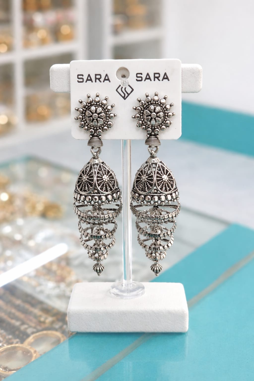 Sara Silver Oxidized 4-Tier Tiered Jhumka Earrings