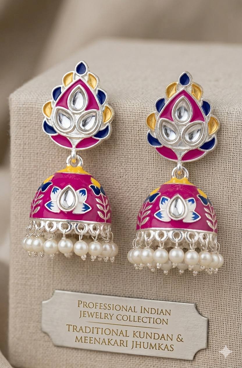 Elevate your jewelry collection with these exquisite Traditional Kundan & Meenakari Jhumka Earrings. Featuring intricate kundan stone work paired with colorful meenakari enamel detailing in pink, blue, and gold tones, these earrings showcase true traditional artistry.